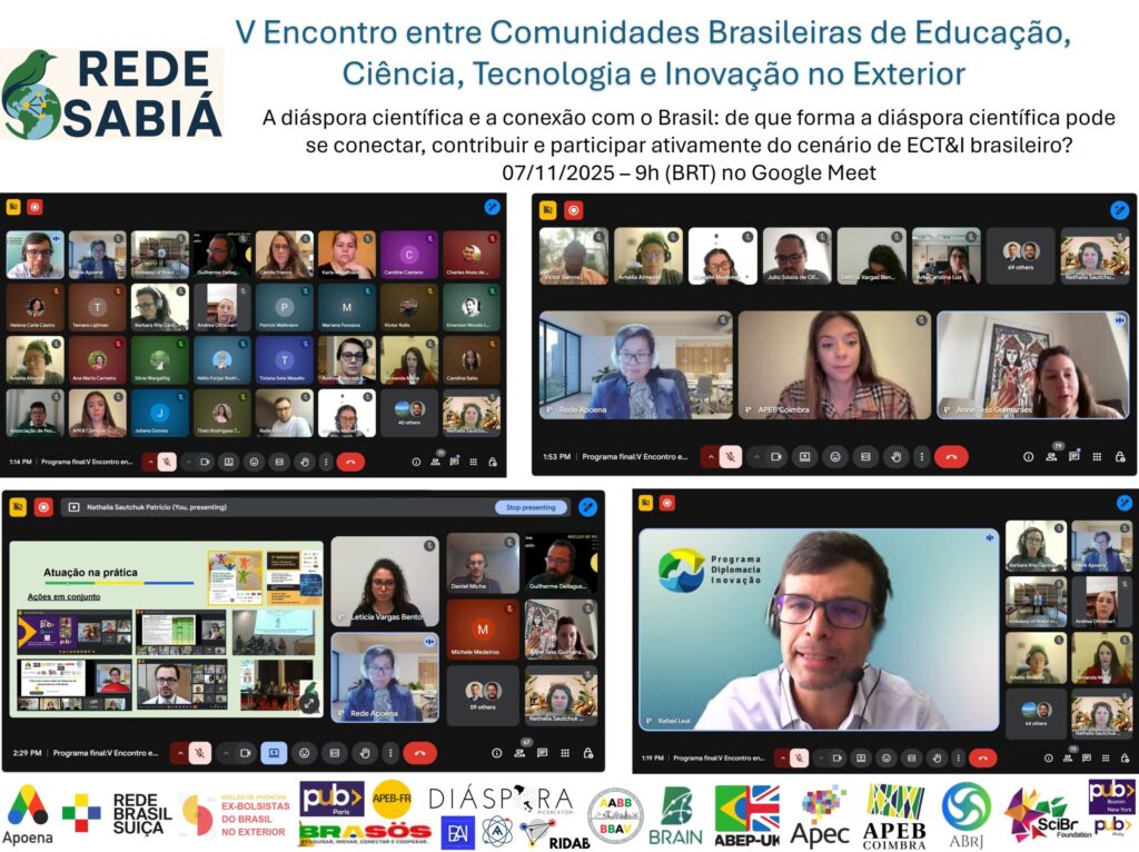 No dia 07 de novembro de 2025, aconteceu o 5º Encontro entre Comunidades da Diáspora Brasileira de ECT&I. Nesse encontro, reforçamos o nosso movimento com a participação de profissionais brasileir@s de mais de 15 países (lista ao fim desse post), em especial dando as boas-vindas a novas comunidades e a profissionais situad@s em países onde o movimento ainda não foi oficialmente formalizado. A Rede SABIÁ foi oficialmente apresentada às comunidades, onde seus objetivos, eixos de atuação, formas de comunicação, dentre outros, foram detalhados pelos membros do comitê gestor provisório.